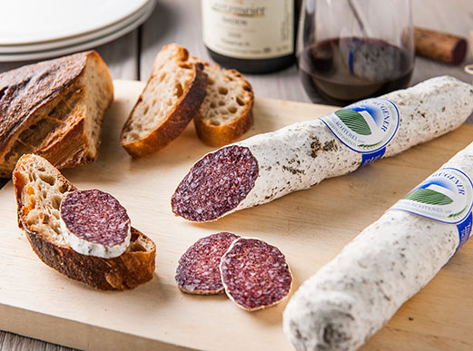 | | schlanke Salami, mediteran mit Edelschimmel gereift, zusäzlich mit getrockneten Sanddornbeeren gewürzt, geben der Salami eine fruchtige Note. Die Sanddornbeeren kommen von unserer schönen Insel. Zutaten: Schweinefleisch, Pfannensiedesalz und Nitrit, Naturgewürze, luftgetrocknet mit Edelschimmel gereift Nährwertangaben: auf 100 g Brennwert 350 kcal. / Eiweiß 32 g / Fett 25 g / Kohlenhydrate 0,5 g / Salz 3,5 g |